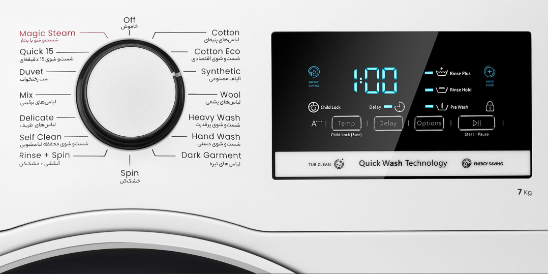 - 15 برنامه شستشو: این ماشین لباسشویی دارای 15 برنامه شستشو است که به شما امکان میدهد لباسهای خود را با توجه به جنس و نوع لکه، به بهترین نحو بشویید.